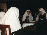 Na scenę wchodzą nowicjuszki z robótkami do haftowania. Siadają przy stole. Haftują rozmawiając między sobą.